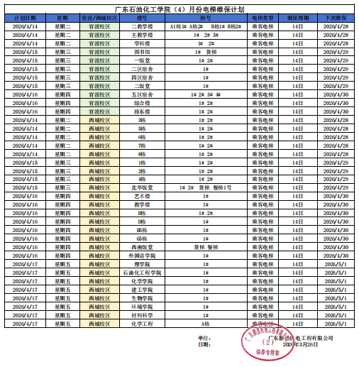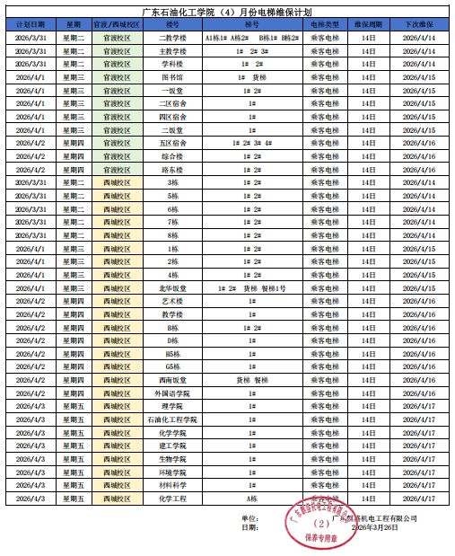 为保障学校电梯安全正常运行,电梯维保公司将例行对全校电梯进行维保。现公布2026年4月全校电梯维保工作计划,详见下图及附件: