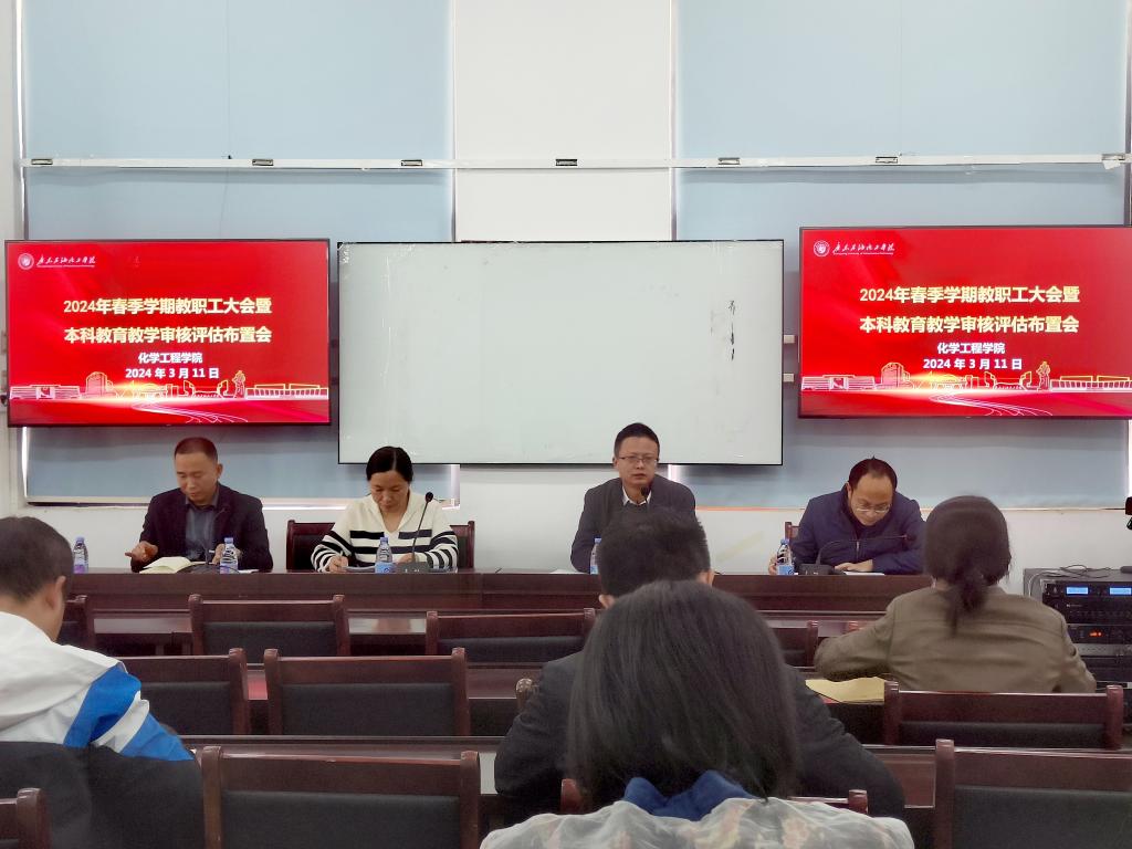 为确保新学期开学各项工作平稳有序进行,高质高效做好本科教育教学审核评估工作,3月11日下午,化学工程学院在化工楼C104会议室召开2024年春季学期教职工大会暨本科教育教学审核评估布置会,会议由化学工程学院院长余长林主持,学院领导班子成员及全体教职工参加。