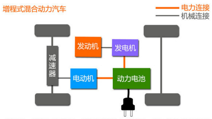 增程式混合动力汽车就是用发动机进行发电,电动机进行驱动的车辆。当电池组电量充足时采用纯电动模式行驶,而当电量不足时,车内发动机启动,带动发电机为动力电池充电,提供电动机运行的电力(即增程模式)。
