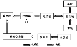 串联式混合动力汽车(SHEV:车辆的驱动力只来源于电动机的混合动力(电动)汽车。结构特点是发动机带动发电机发电,电能通过电机控制器输送给电动机,由电动机驱动汽车行驶。另外,动力电池也可以单独向电动机提供电能驱动汽车行驶。