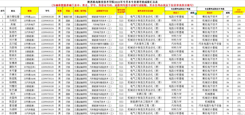 根据陕西机电职业技术学院专升本专业课考核通知要求,交通运输学院3月3日统一组织专业课考试,现将2025年专升本专业课考核成绩公示如下: