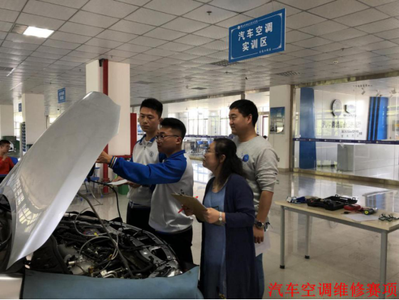 汽车空调维修赛项,学生都能正确操作仪器设备,对指定汽车空调的故障诊断、制冷剂回收、空调系统的抽真空、制冷剂的加注以及汽车空调系统整体性能检测等工作,判断该汽车空调整体性能的优劣。