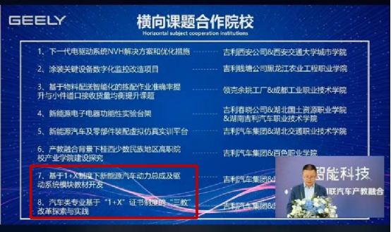 会中发布了2022年吉利汽车横向课题项目,我院2个课题成功入选,分别是“基于“1+X”制度下新能源汽车动力总成及驱动系统模块教材开发”和“汽车类专业基于“1+X”证书制度的“三教”改革探索与实践”。