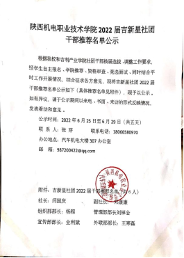 根据我校团委和吉利产业学院社团干部换届选拔、调整工作要求,本着公开、公正、公平的原则,经学生自主报名、学院推荐、资格审查、竞选面试、同时结合平时工作开展情况综合考察,拟定新一届吉新星社团社长、副社长及其他社团干部等6人。经6月25日至6月29日五天公示无异议,将名单上报,经学院和吉利汽车集团批准,最终确定闫国庆等6人为陕西机电职业技术学院2022届吉新星社团干部。