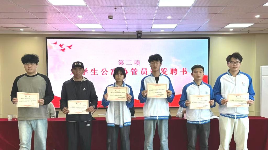 仪式上,学生工作办公室主任董妍带领学习了《党员擎旗强五标,团青砺行塑新貌“5s管理筑馨舍——共育交通匠韵宿舍文化”活动》文件。党支部书记王枢、校公寓管理科科长张海波为学生公寓协管员颁发聘书,并表彰上周优秀打卡宿舍。