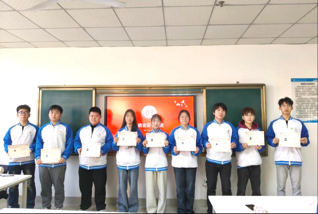 活动现场,李果繁同学组织大家按小组有序传阅优秀笔记,笔记字迹工整、内容详实,生动展现了学子们学思践悟的扎实成效,通过分享学习亮点与感悟,促进了彼此对本主题的深化理解。随后的结业证书颁发环节,主持人宣布在入党积极分子中获得结业证书的同学名单,李健同学组织入党积极分子依次上台领取证书。全体合影留念,将“学有收获、勇担使命”的成长瞬间定格。这沉甸甸的证书,不仅是对培训成果的认可,更是对未来责任担当的殷切期许。