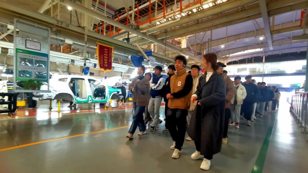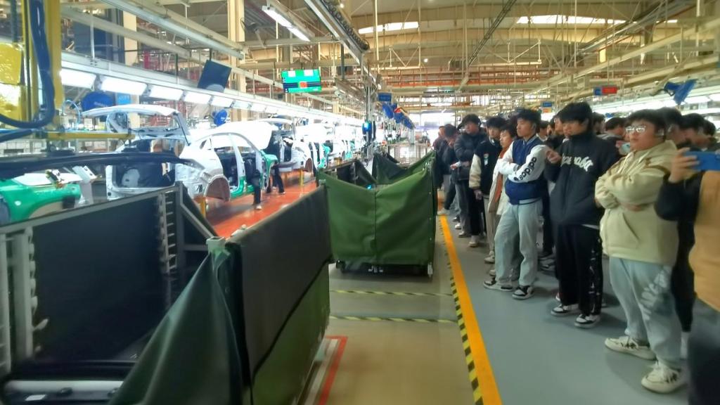 韩雪、刘双平、李子卓三位教师带领学生在智能化厂房中有序参观,看见焊装机器臂在车身周边的灵活摆动、焊接时飞溅出的火花、徐徐前行的AGV小车,学生们表现积极活跃,不时向陪同参观的企业人员询问技术细节和生产管理知识。