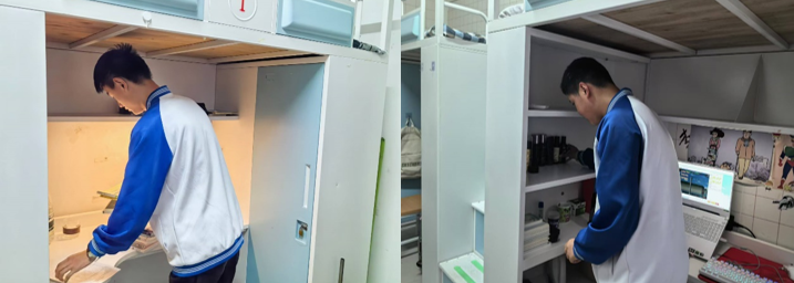 以团学为助力,入党积极分子代表成佳彤和团员代表容一凡、吕伟也积极参与其中。他们以实际行动带动身边同学,共同为提升宿舍环境努力。在整顿过程中,大家齐心协力,对宿舍内的物品进行分类整理,将常用物品放置在便于取用的位置,不常用的物品妥善收纳,使宿舍空间更加整洁有序。