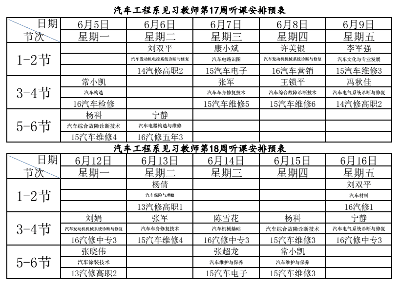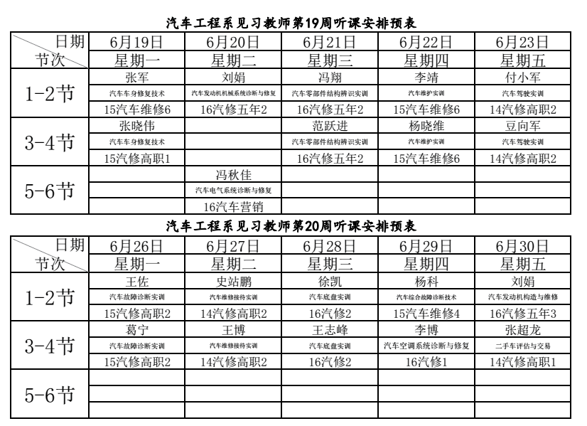 随着毕业季的到来,我系今年新招聘的大学毕业生已陆续报道。为使见习教师快速成长,能独立承担教学任务,系部统一安排见习教师集中听课。具体安排如下表。望各位老师积极准备,圆满完成对见习教师第一阶段的培养。