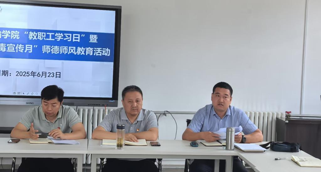 会议第三项,师德师风教育着重学习“6月全民禁毒宣传月”相关文件,冯秋佳领学《共同守护 让青少年远离涉麻精药品等成瘾性物质滥用危害——致青少年、家长和社会各界的倡议书》,学院全体老师观看了禁毒宣传片《危险的药品》,增强了教师对毒品危害的认知,强化育人责任意识。同时,会议明确要求各班级近期需组织开展以“珍爱生命 远离毒品”为主题的班会,引导学生增强识毒、防毒、拒毒意识,营造健康无毒的校园环境。