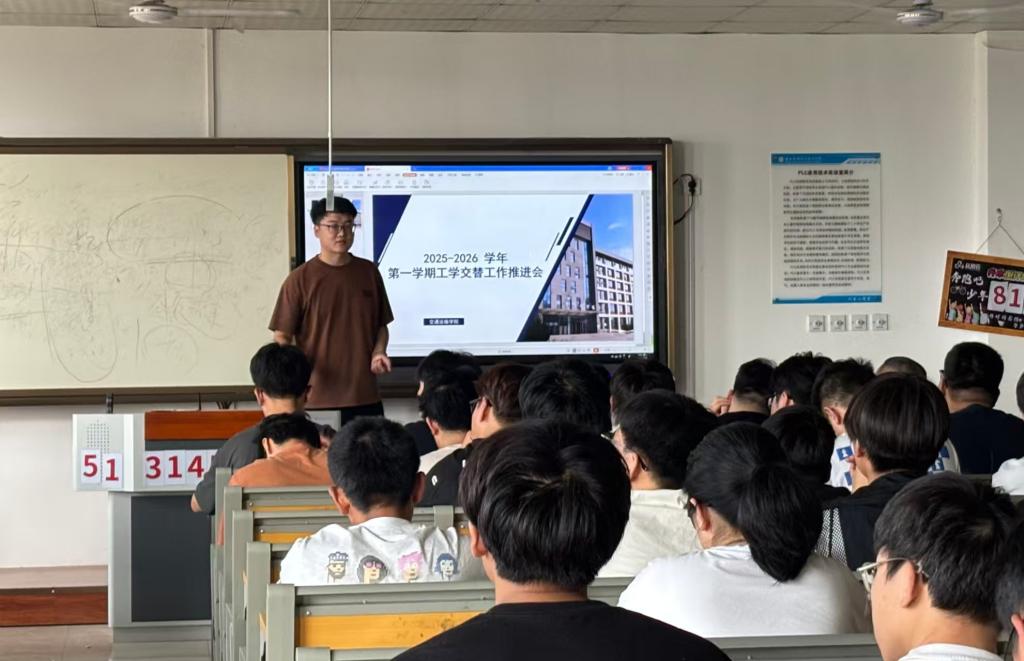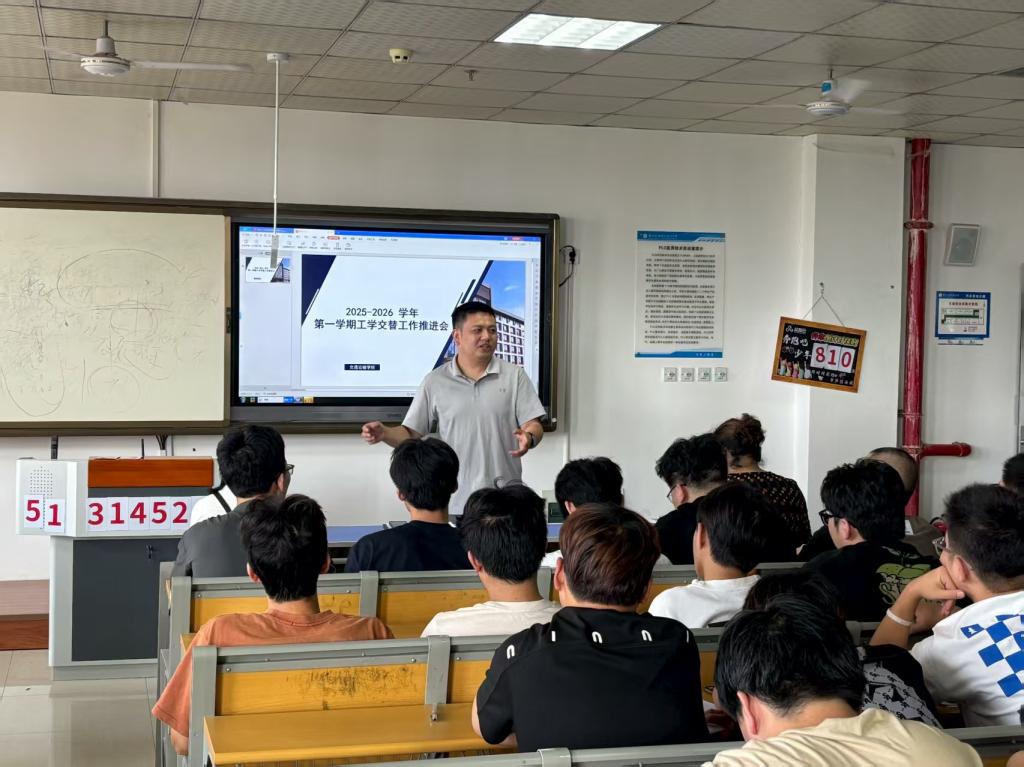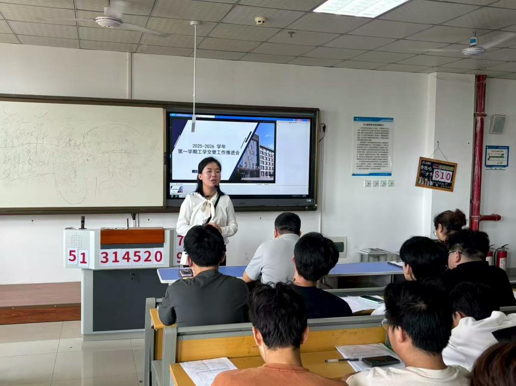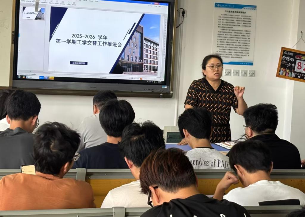 交通运输学院于2025年9月1日在汽车机电大楼502阶梯教室开展2025-2026学年第一学期工学交替工作推进会,党支部书记王枢、副院长冯秋佳、新能源系主任张超龙、学工办主任董研出席会议,会议由教学与管理科科长张婷主持,相关班级班主任参会。