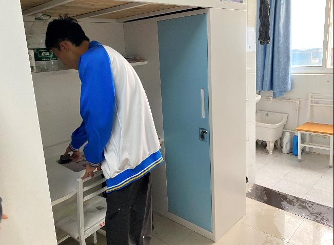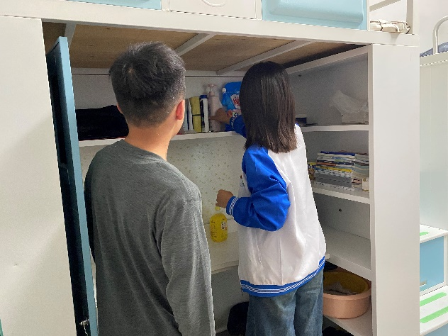 入党积极分子马鑫伟协助同学认真整理衣物、摆放生活用品。团员代表张辰瑕和赵帅以饱满的热情带动身边的同学一起参与。张辰瑕一边整理,一边和同学交流心得,分享整理小窍门。