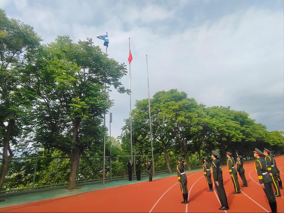 伴随着激昂的国歌声,鲜艳的五星红旗缓缓升起,全体师生庄严肃立,向国旗行注目礼,高唱国歌。