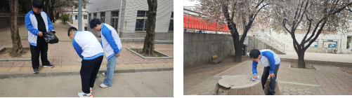 同学们手持竹夹与可降解塑料袋,弯腰俯身清理花坛缝隙中的烟头、纸屑;用消毒抹布反复擦拭宣传栏玻璃与长椅,阳光下公共设施焕然一新;