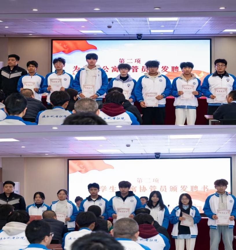 会议现场,学生工作办公室主任董妍宣读了此次活动的方案,明确以汽车行业5S管理标准为蓝本,构建"整理、整顿、清扫、清洁、素养"五位一体的宿舍管理体系。公寓管理科同步聘任14名学生担任内务稽查员并由张海波科长现场颁发聘书,王枢书记与张海波科长共同为"优秀打卡宿舍"颁发奖状以树立标杆、激发全员参与热情。