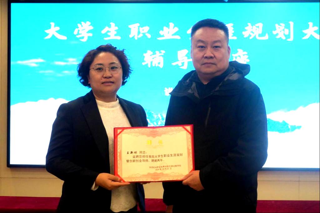 最后,学院教学与管理办公室主任张婷代表学院为王新刚颁发聘书,聘任其为交通运输学院大学生职业生涯规划暨创新创业导师。