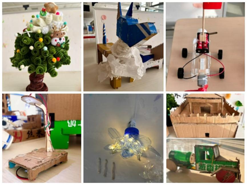 本次再生艺术展特别展示了学生们在手工创意实践中的作品,大家精心准备,用废旧纸壳创造出一件件“再生艺术品”,如声控灯、小动物、圣诞树、电动小汽车等再生艺术品,这些作品将汽车专业的知识与环保再生及劳动的理念紧密融合。